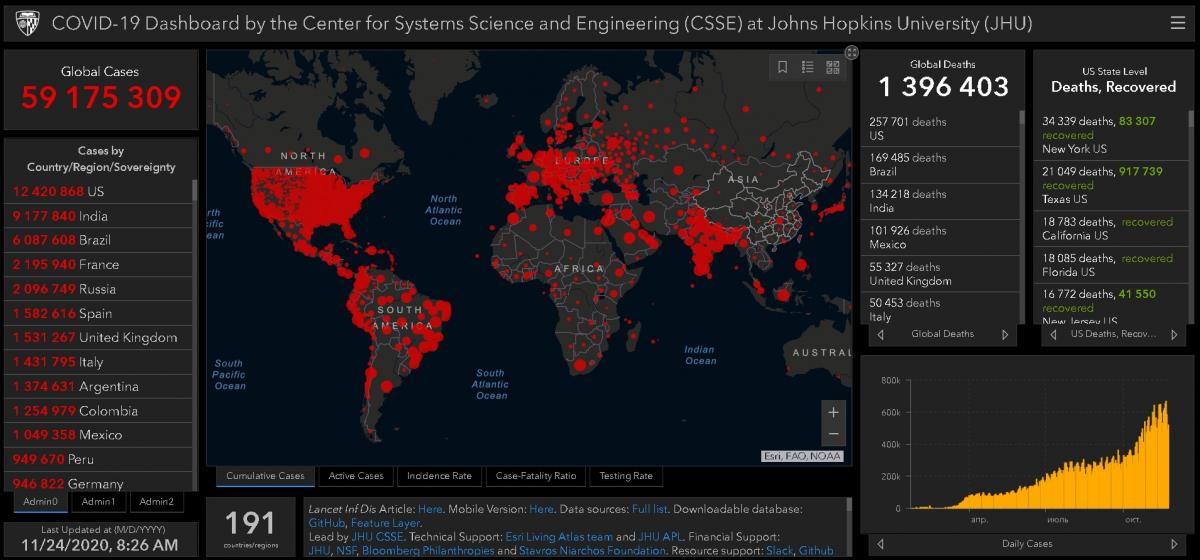 По данным Института Джона Хопкинса (США), по состоянию на утро 24 ноября в мире зафиксировано более 59 млн случаев заражения коронавирусом (59 175 309). 1 млн 396 403 случая оказались смертельными.